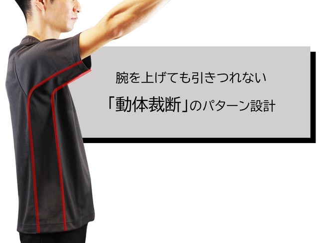 それに対して動体裁断は⼈体の全ての関節が曲がった姿勢を原型に、運動時の⽪膚の動きとシワを分析し設計されているため、身体の動きにフィットしつつも引きつれがなく、今までに体験したことのないノンストレスな着⼼地の⾐服になります。