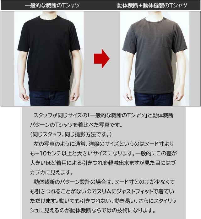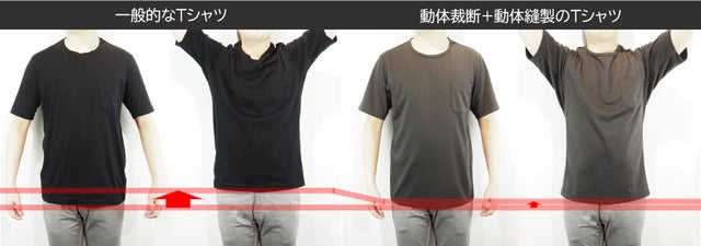 写真左のように一般的な裁断のTシャツだと、腕の動きに引っ張られて裾が上がったり、シルエットが崩れたり、時には背中やおなかが見えてしまうことも・・・。