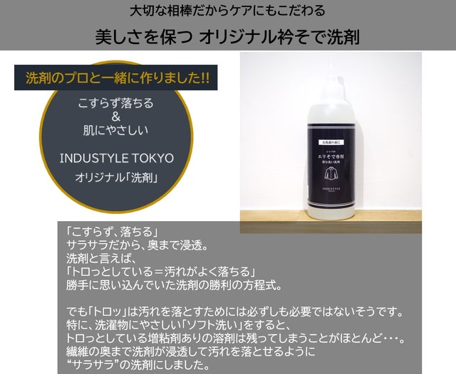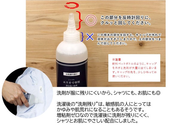 そんな想いから、洗濯のプロ、ワイズプラントさんと一緒にオリジナル『エリそで専用洗剤』を作りました。