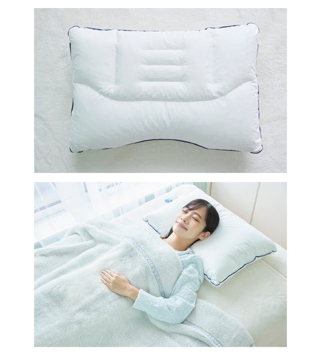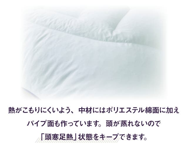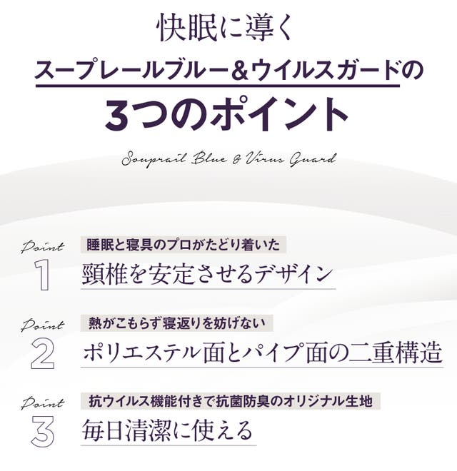 スープレールブルー&ウイルスガードは、ポリエステル綿とソフトパイプの二重構造。柔らかく頭を支えながら、熱がこもりづらく、へたりにくい構造になっています。