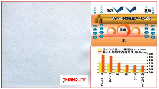 こうした機能が評価され、世界を代表するアウトドアブランドにも採用されている優秀素材です。※サーモライト(THERMOLITE)はThe LYCRA Companyの商標です。