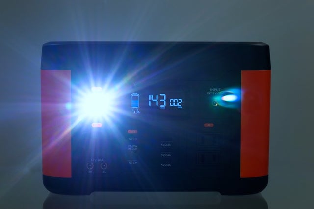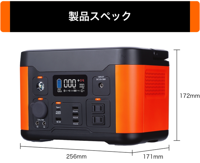 製品の前面にディスプレイと出入力ポートがスッキリとデザインされていますので、ポータブル電源初心者でも迷わずに操作ができます。液晶ディスプレイには、電池残量表示、使用可能時間目安などが見やすく表示され、使用状態や充電のタイミングがひと目でわかります。