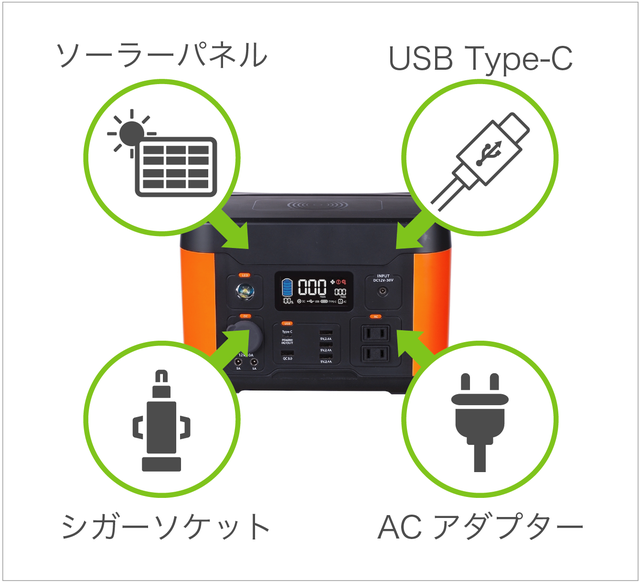- 5タイプの出力ポートから、11個のデバイス・電気製品に同時給電!災害時にも大活躍