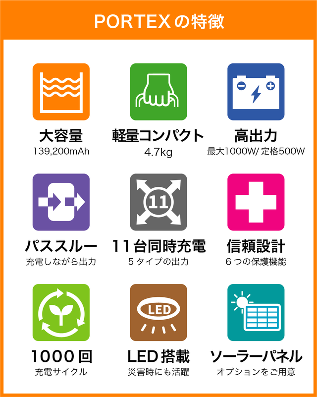 【PORTEX】は、高出力を必要とする電化製品により対応できるように2口のACポートを搭載。合計最大1000W(定格500W)の安定した出力でパワフルに給電しますので、今までモバイルバッテリーでは対応できなかった家電製品を自宅と同じように使えます。