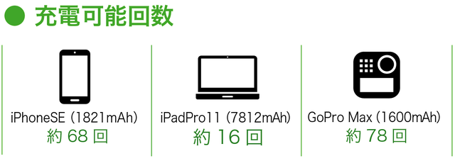 常に充電しておきたいスマホやパソコン、 ビデオカメラ、ドローン、ゲーム機など、お手持ちのデバイスを何度も繰り返し充電できますので、バッテリー残量を気にせずアウトドアを満喫できます。