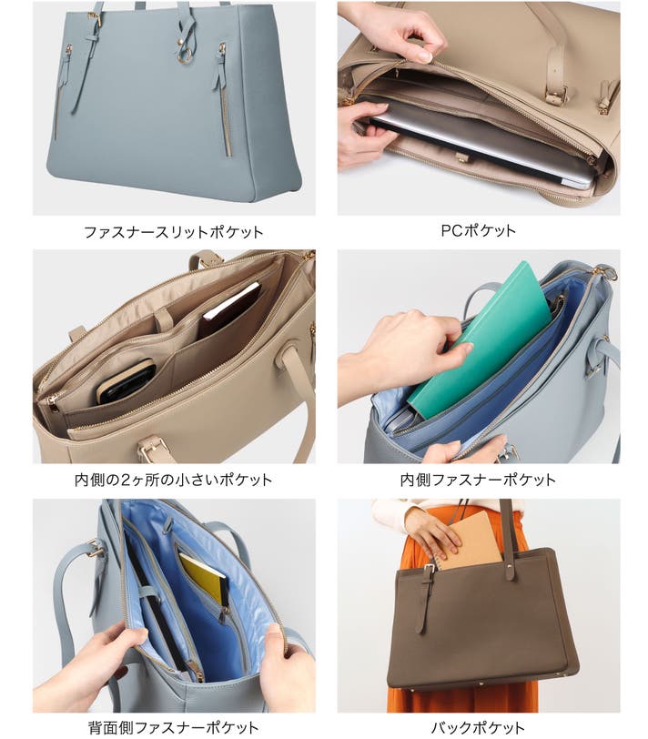 荷物が多い日でも気分が上がる、豊富なカラーバリエーション。オフスタイルにも自然に馴染むカラーをご用意しているので、プライベートでも活躍します。シンプルながらも上品な佇まいで、オン・オフ問わず活躍する、頼れるバッグです。