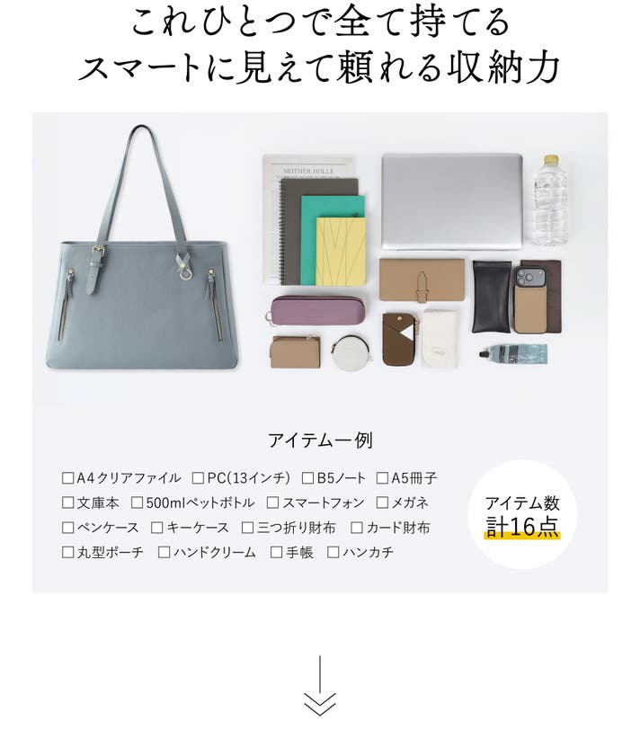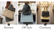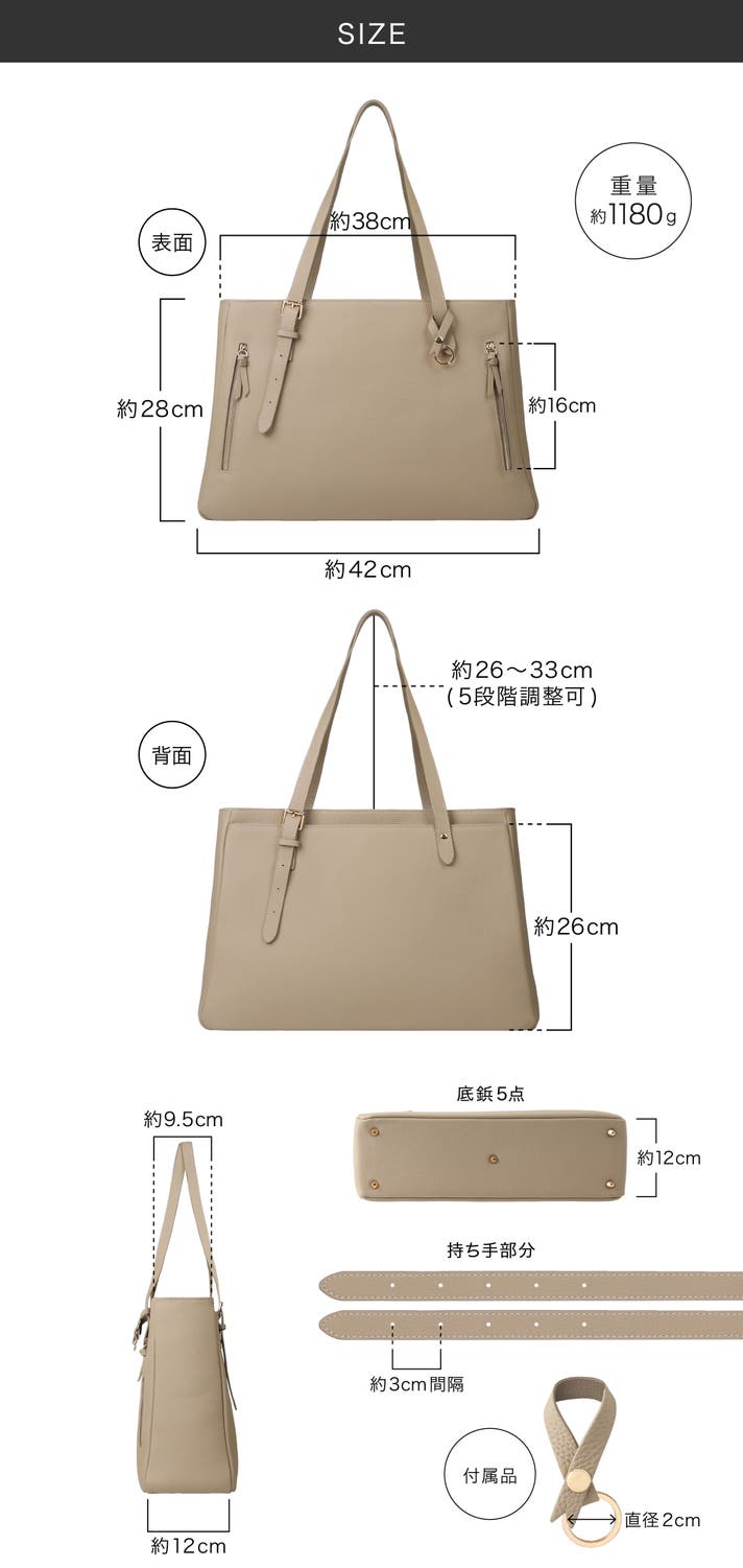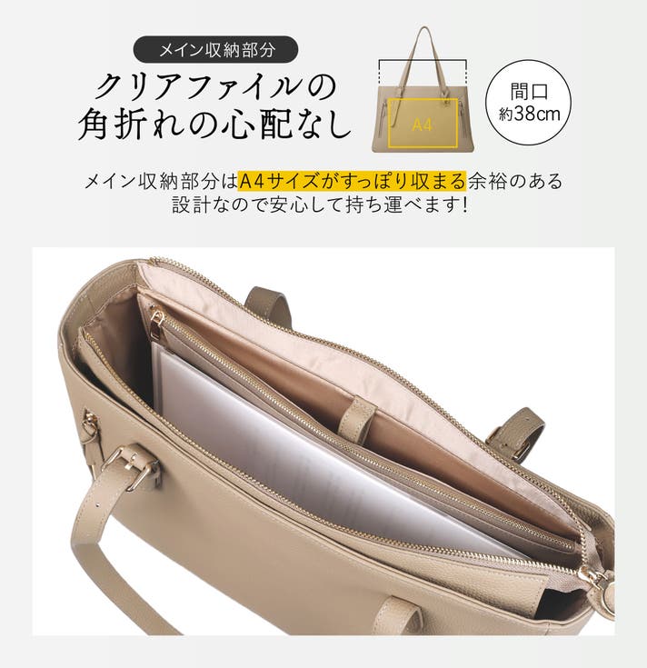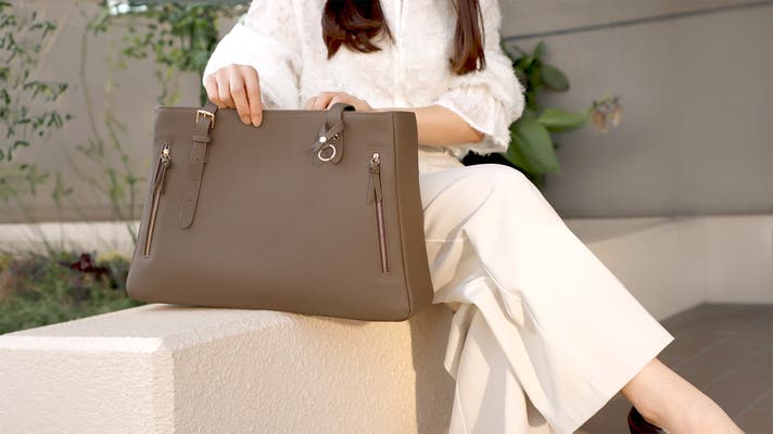 落ち着きのあるシックなカラーと、上質な質感が魅力のバッグ。商談や会議といったフォーマルな場でも上品さを損なわず、好印象を与えます。実用性と洗練を兼ね備えた働く女性に寄り添うデザインです。