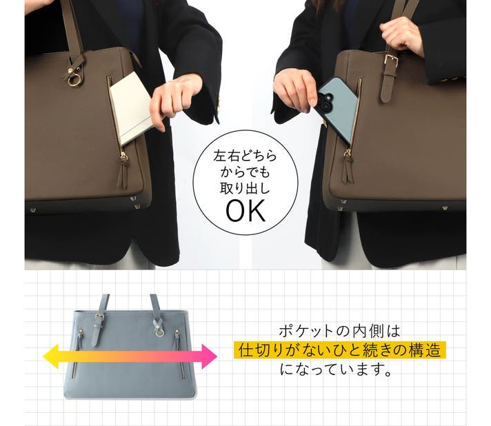 利き手に関係なくどちらの手からでもスムーズに取り出し可能。電車などの人が多い場所や狭い場所でも、持ち替えることなく取り出し可能。