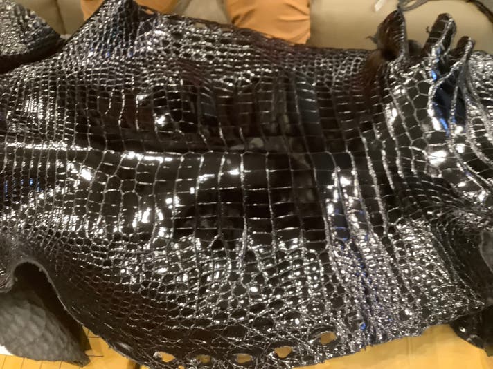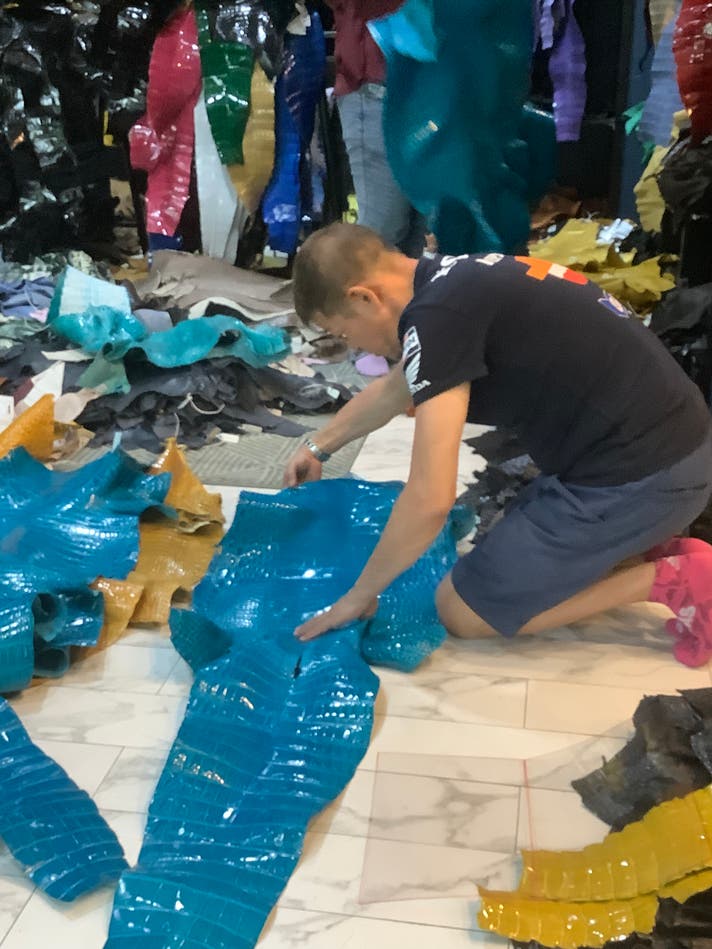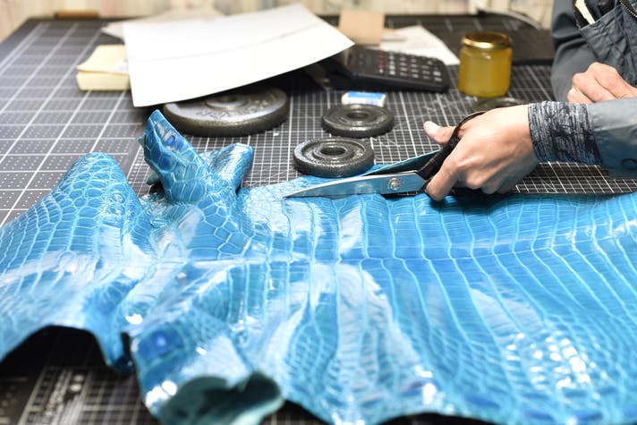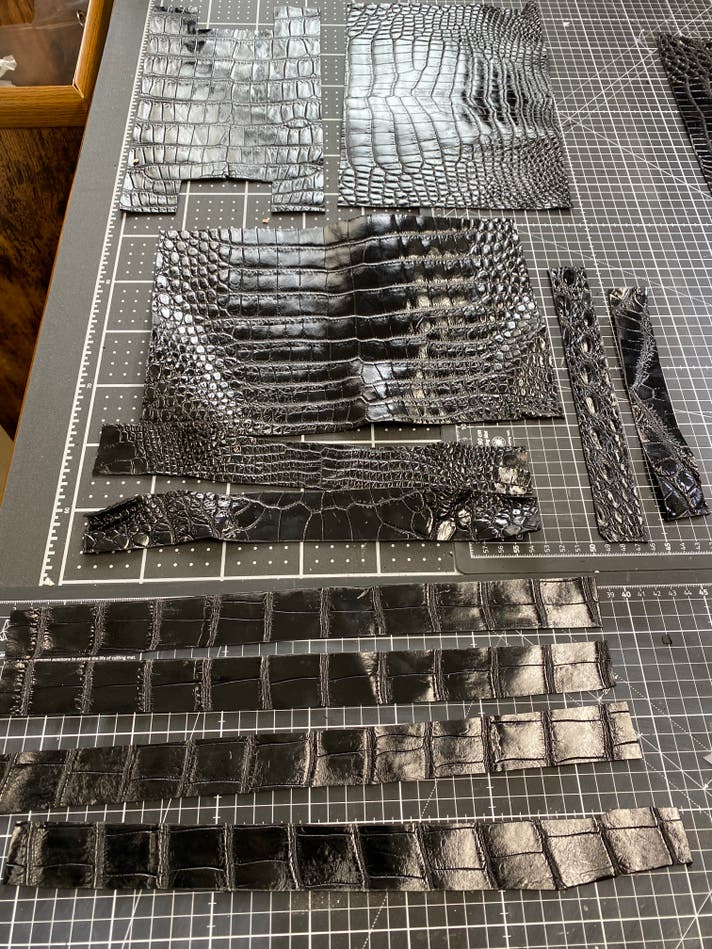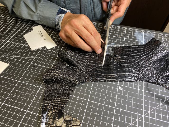 ・型紙に沿ってクロコダイルレザーとウルトラスエードを裁断