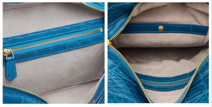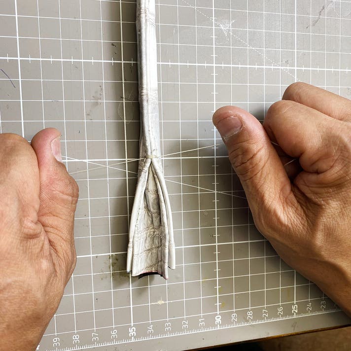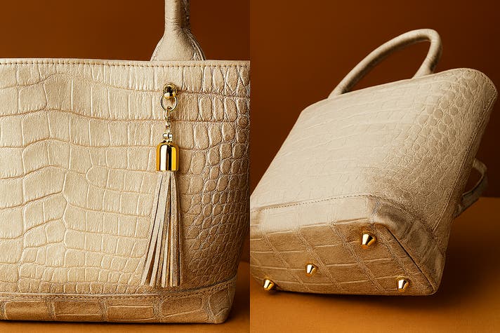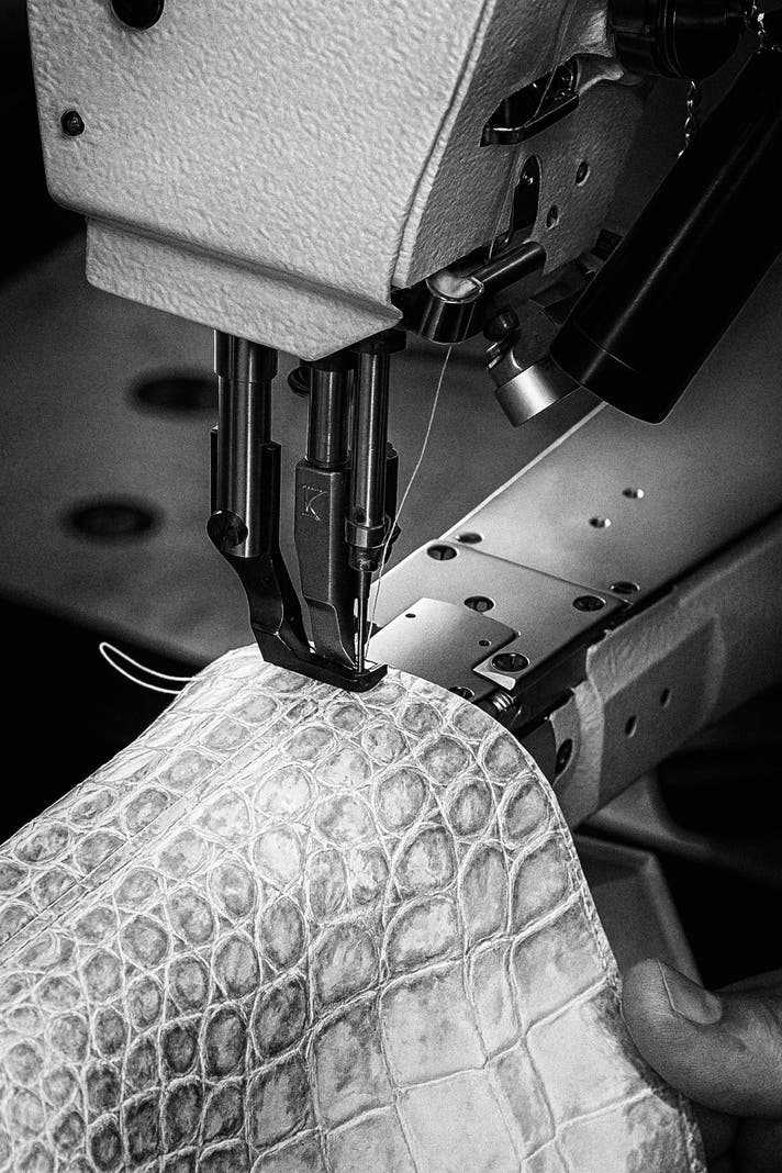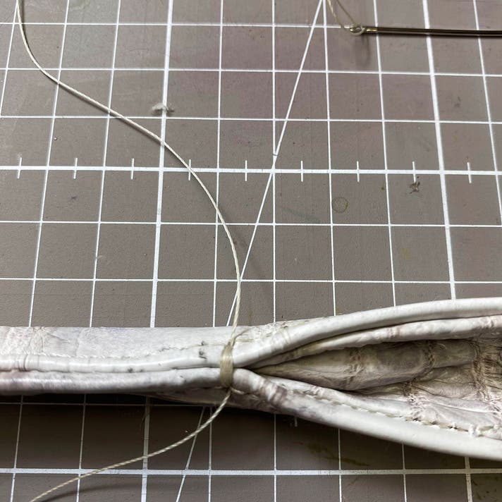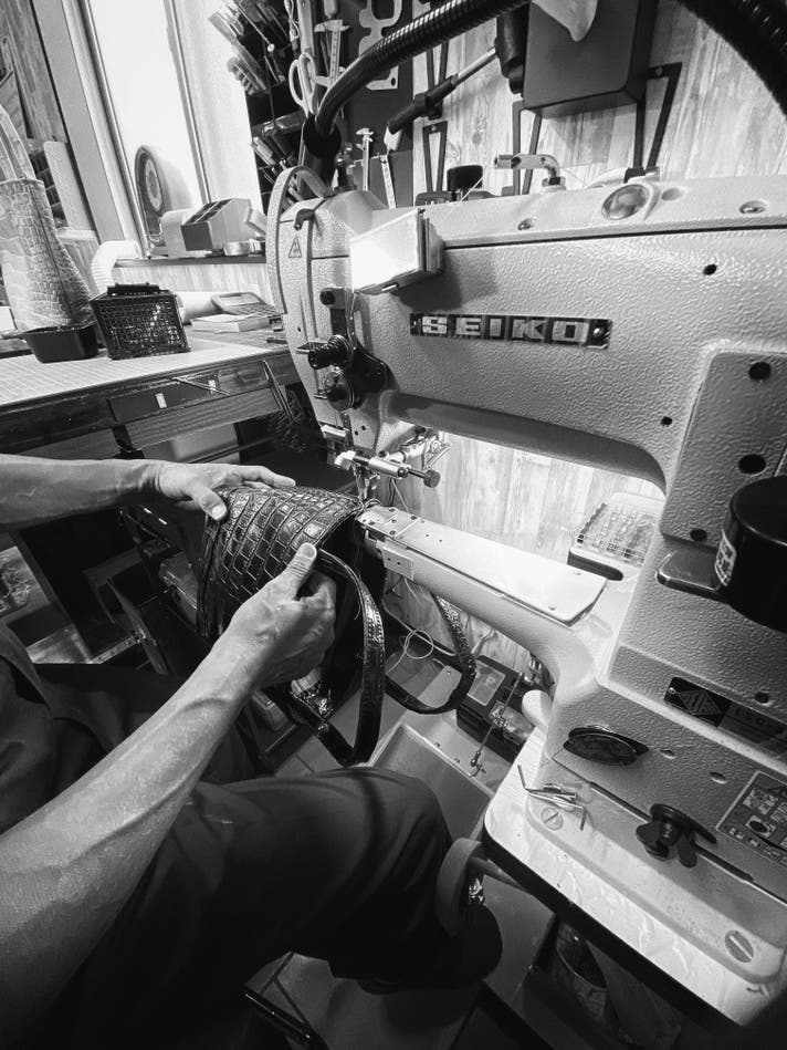 この写真は、クロコダイルレザートートバッグのハンドルの縫い終わりを手縫いで仕上げる工程を示しています。