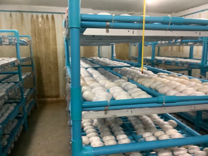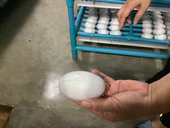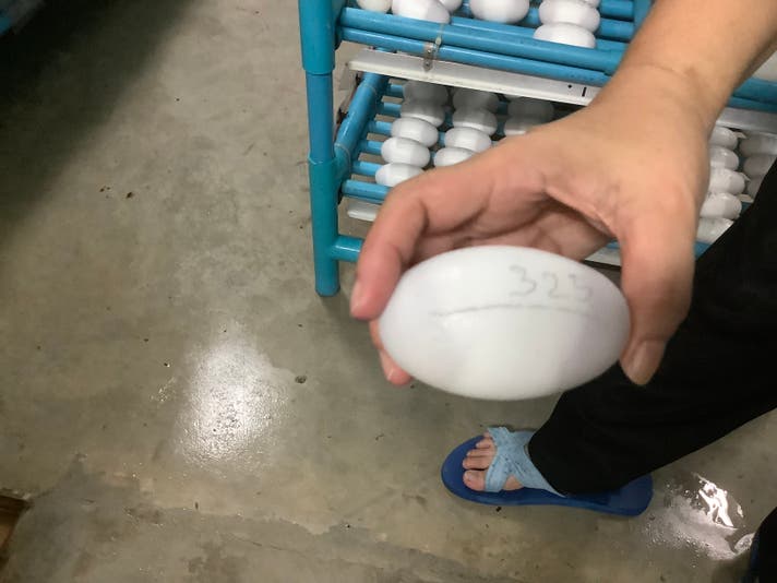 1つずつ登録番号を記入し、湿度99%の保温室で管理されます。卵の向きを誤ると死んでしまうため、その場で登録番号を記入し、裏表を厳密に確認しています。