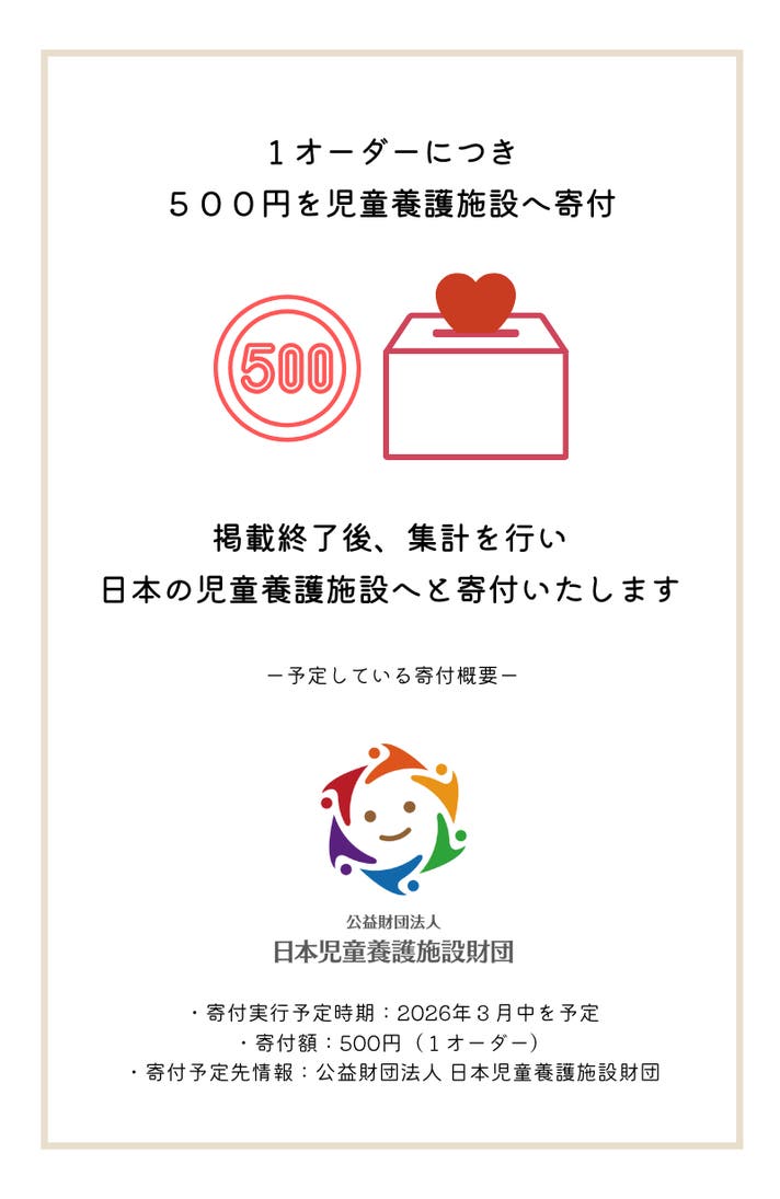 - 未来の子供達の輝きを守ろう。1オーダーにつき”500円”を”日本の児童養護施設”へ寄付します。
