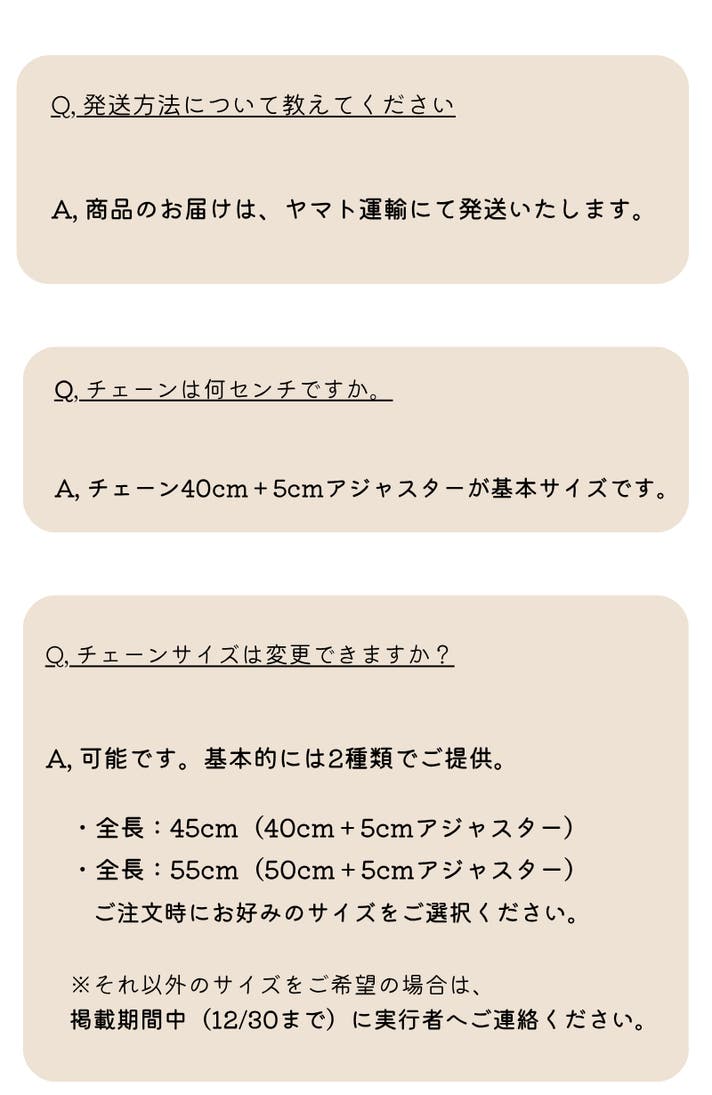 1点1点手作業で仕上げてお送り致しますので、原材料の仕入れの関係などにより表記の納期より前後する場合がございます。その際はメッセージにてご連絡させていただきます。