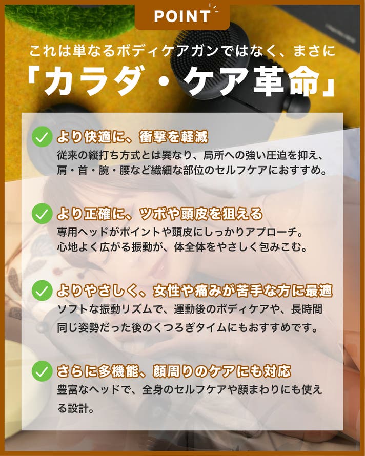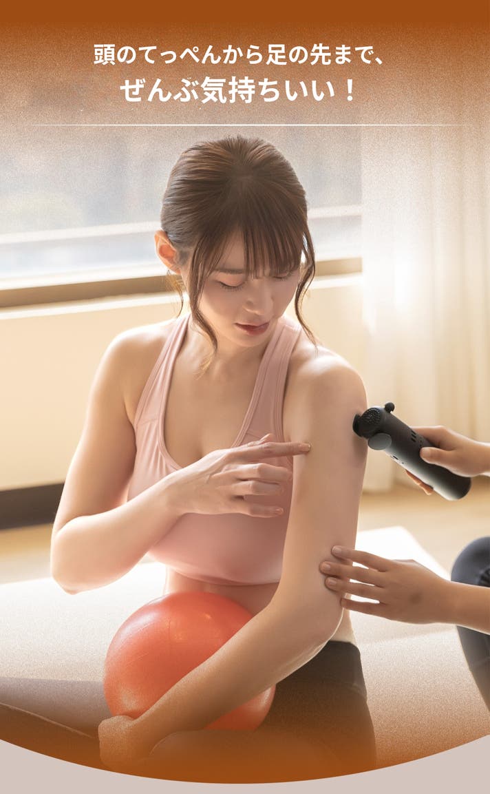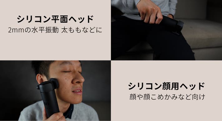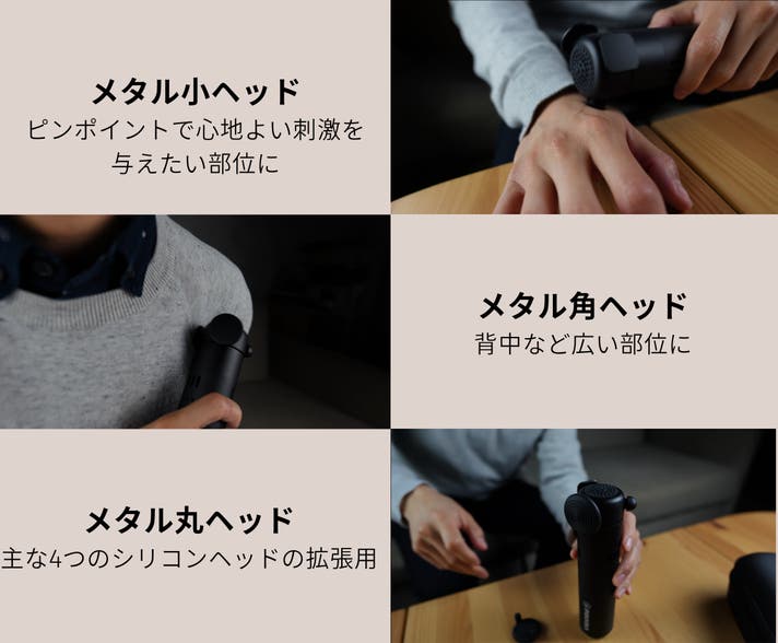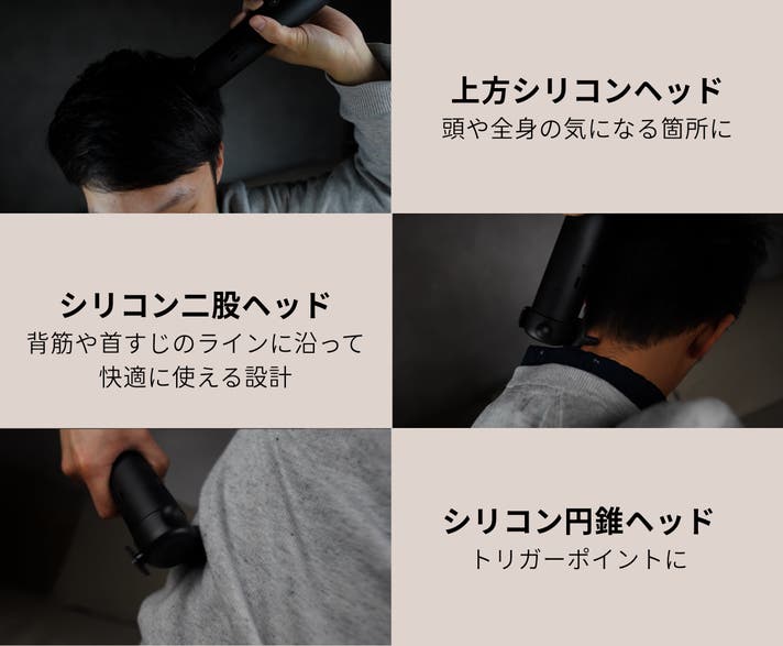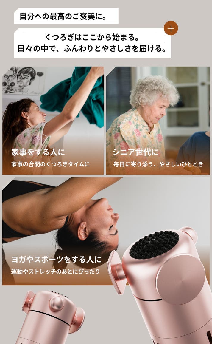- 4段階スピードと8種類のヘッドで、からだ全体をやさしくいたわる。新しい心地よさ体験。