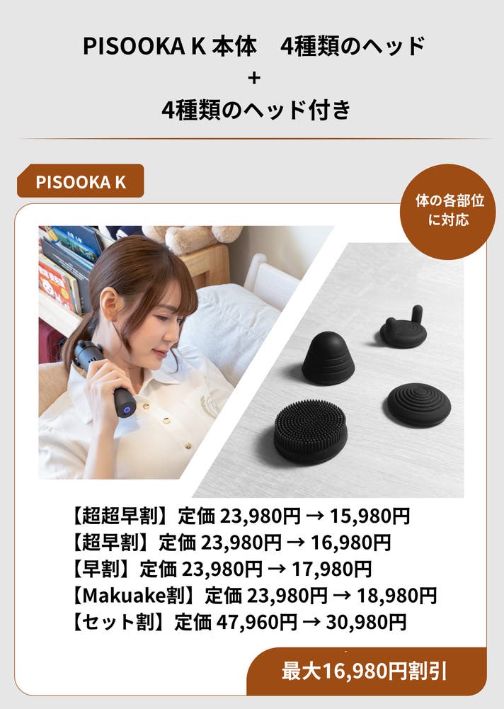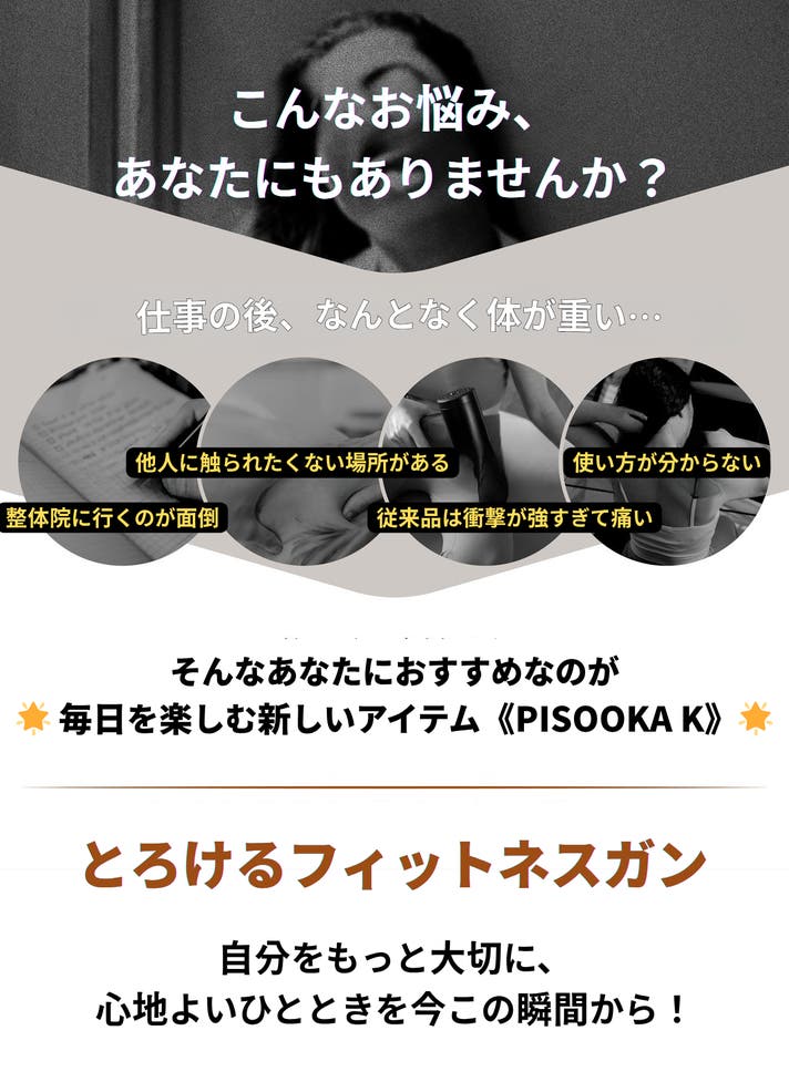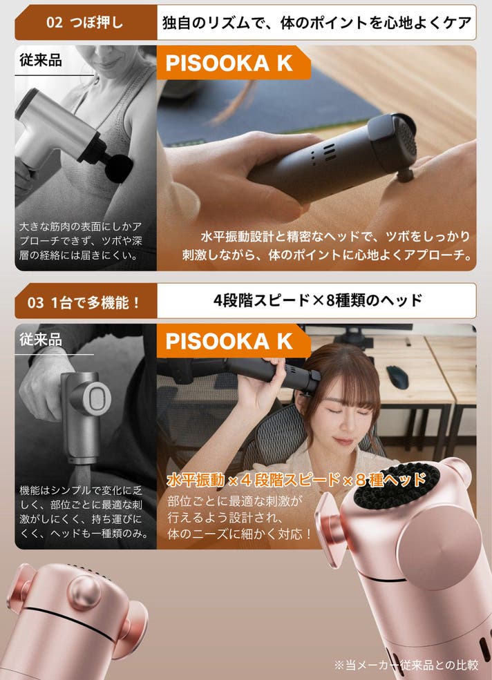 製品のご購入時からご購入頂いた後まで、常に+αの付加価値提供を追求しています。今後もサポーターの皆様が笑顔になる製品をお届けしてまいります。今回紹介させていただく「PISOOKA K 次世代フィットネスガン」はくつろぎの新時代を先導する製品です。毎日の生活で感じる体の重さに、しっかりアプローチ。おうちや職場の休憩時間など、ちょっと一息入れたい時にこの製品をお試しいただければ幸いです。