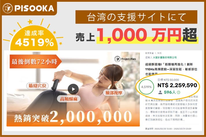 リターン品の配送が完了するまで、株式会社楽京は「Project Mars」の製品「PISOOKA K 次世代フィットネスガン」の日本における独占販売権を有する正規代理店です。詳細に関しては、ページ下部のリスク&チャレンジをご確認ください。