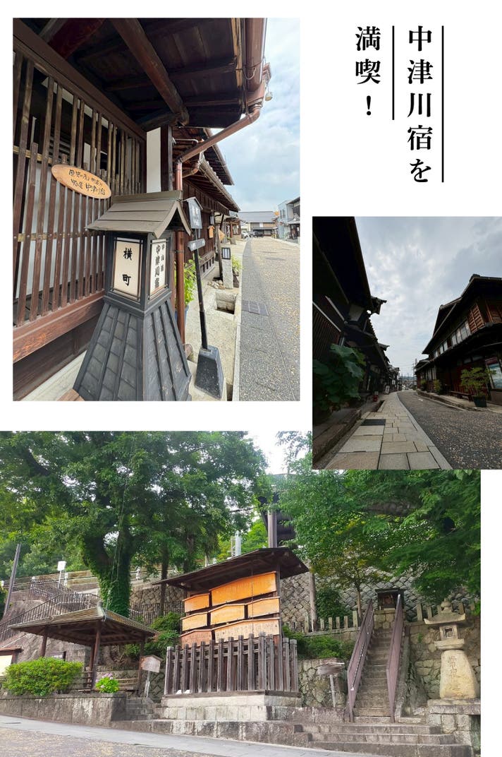 中山道、本陣跡、脇本陣跡、中山道歴史資料館、高札場、にぎわい特産館、和菓子店、造り酒屋、五平餅、中津川橋など、宿場町ならではの情緒あふれる雰囲気を堪能できます。