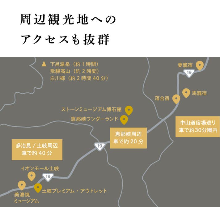 焼物の聖地「美濃」や下呂温泉、飛騨高山へのアクセスも良好。