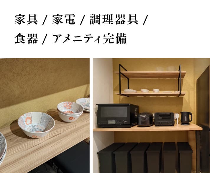 キッチンには調理器具や食器も完備してあるので、旅の外食に疲れたらご自分で自炊することも可能です。