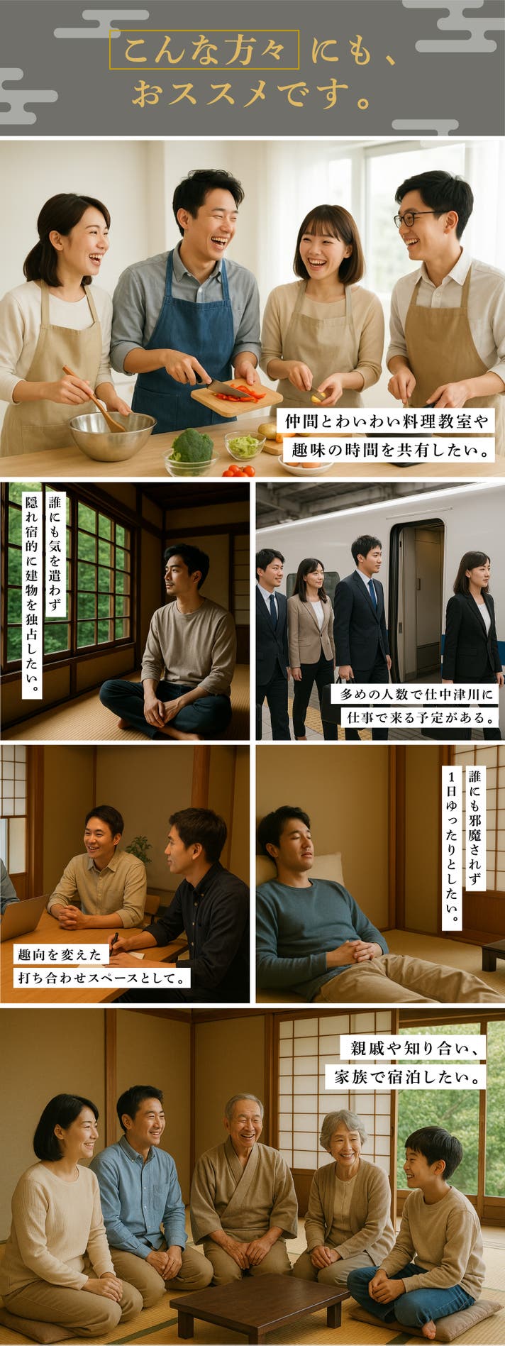 ご家族連れはもちろん、仲間同士の旅やグループ旅行にも、お使いいただけます。