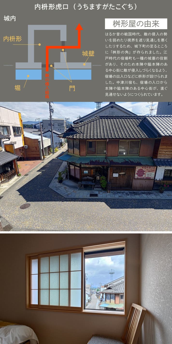 歴史の町に宿泊していることを実感していただくため、屋内から中山道の桝形を見ることができる造りにしました。