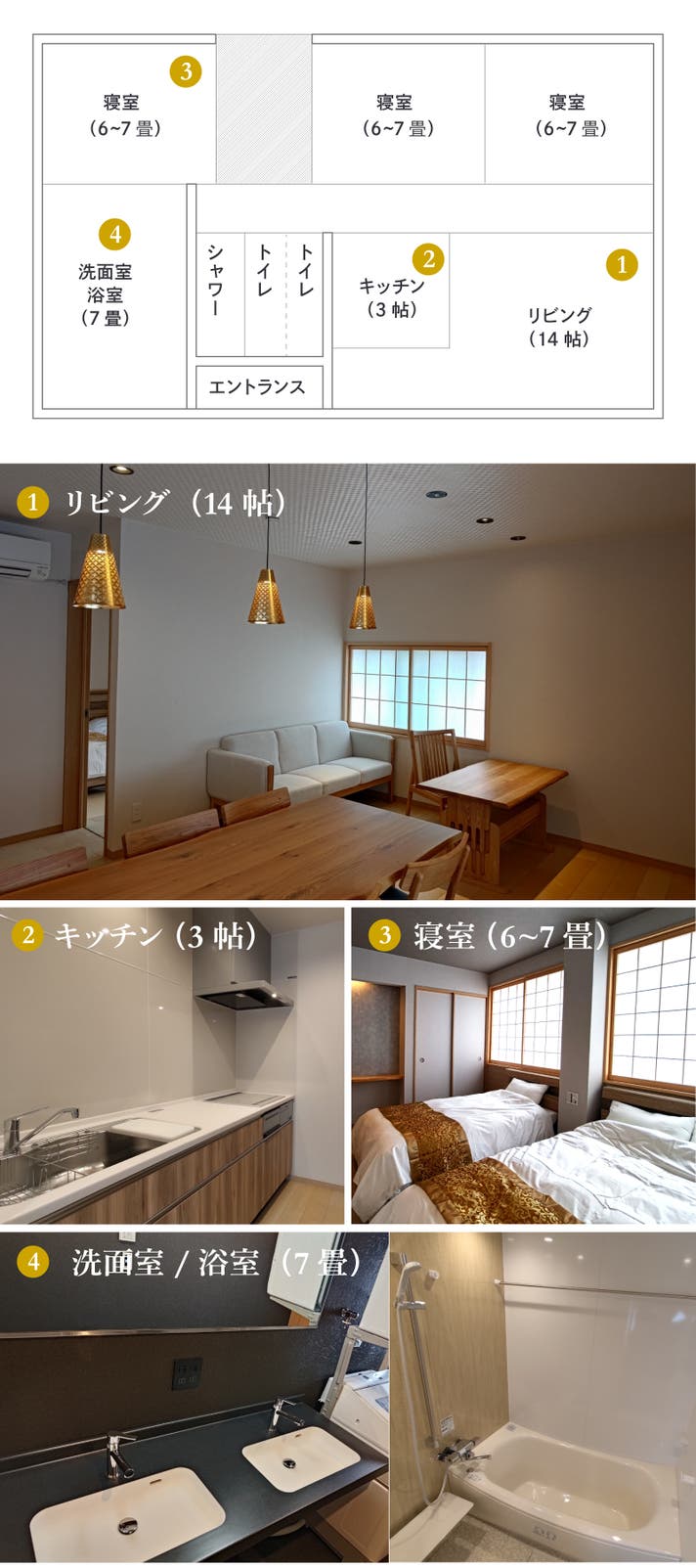 広々としたリビングの他、寝室が3部屋、トイレが2か所、お風呂とシャワーが1か所ずつあります。