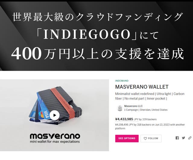 マスヴェラーノのカードケースは、海外で有名なサイト「INDIEGOGO」にて、400万円以上の支援を達成いたしました。