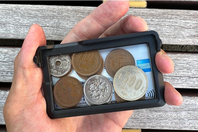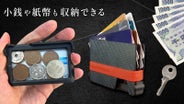 そしてカードだけでなく、小銭を中に入れることができ、シリコンバンドで紙幣を挟むことができる設計。