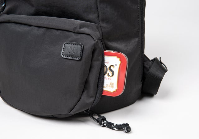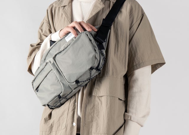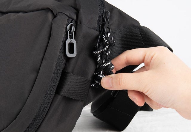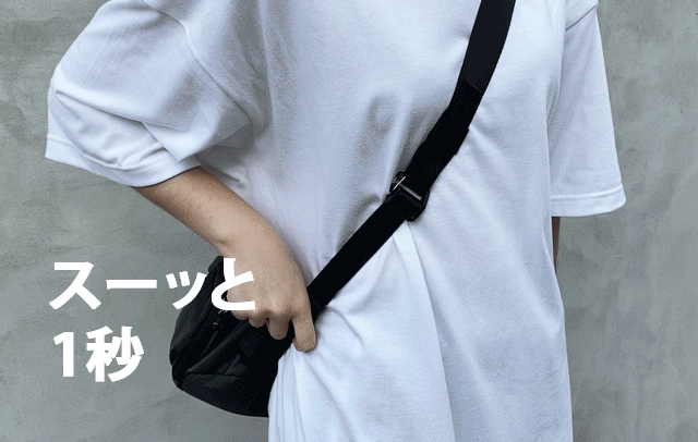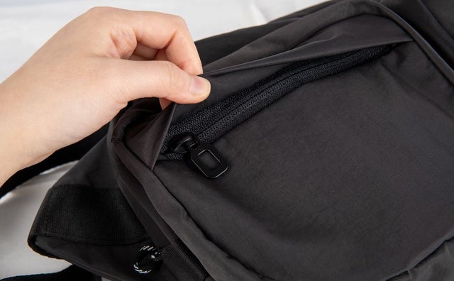 スリングバッグとして使用する際は、サイドジッパーで素早く持ち物を収納できます。