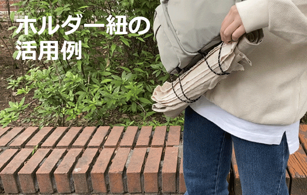 バッグの下段にあるホルダー紐でオーバーなどを簡単に括ってまとめることができます。使用してない時は下記写真の側面バンドに引っ掛けてまとめておくことができます。