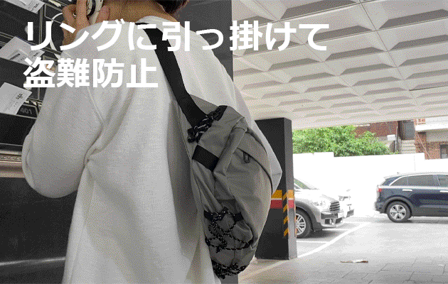旅行先や地下鉄でスリングバッグを後ろに掛けていると「誰かがジッパーを開けて貴重品を盗るかもしれない」、と常に不安があります。だから盗難防止のために下記写真のようなリングを取り付けました。ジッパーをリングに引っ掛けて固定、メインジッパーが簡単に開けられないようにして少しでも楽な気持ちで外出してください。