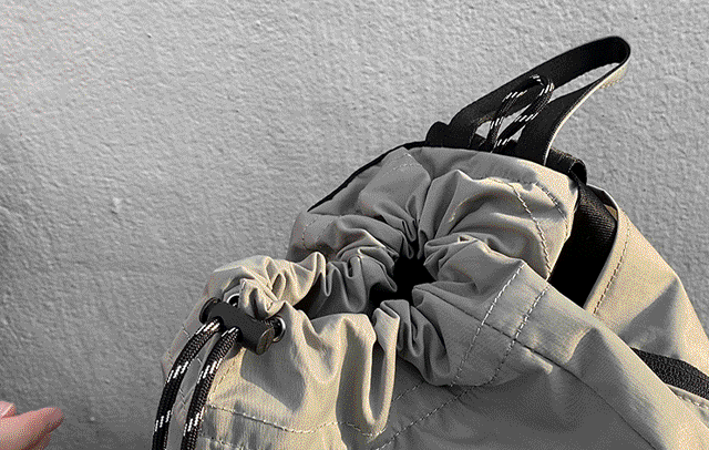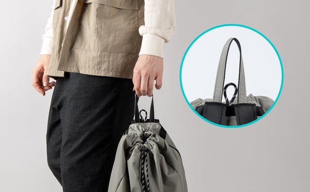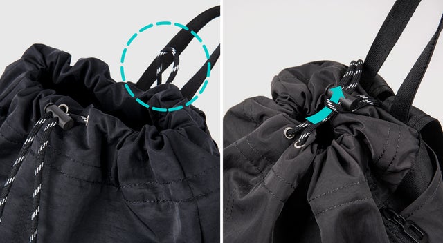 小さい輪に紐を通してしっかりと固定すればストリングが簡単に解けたり、バッグの入り口が広がるのを防いでくれます。