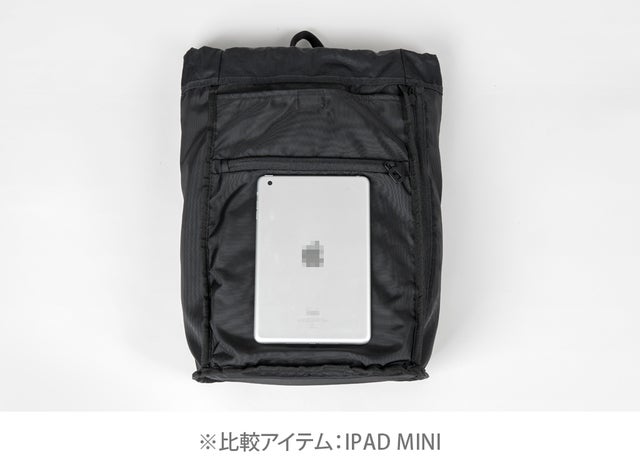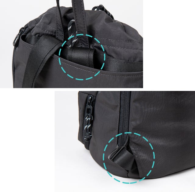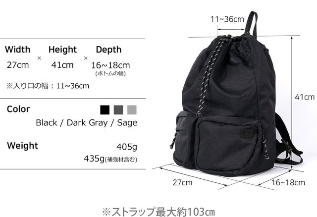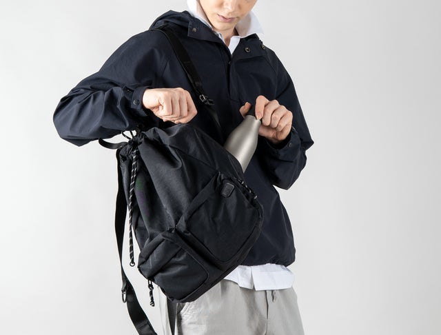 ※生活防水は日常生活の範囲内において可能な防水で、完全防水ではありません。デザインの特性上、ストリングを締める入り口部分は隙間が空いており水が入る恐れがありますので、ご使用には十分ご注意ください。暴雨の中でのご使用はお控えください。
