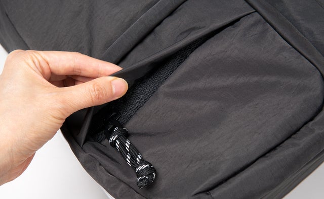 メインポケットはダブルジッパーで左右どちらの肩に掛けても持ち物が取り出しやすいようにデザインしました。また、ポケットの入り口が広いので目的のものを取り出しやすく、また収納しやすいです。