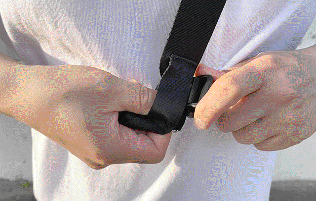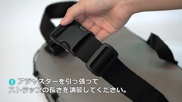 バックルでストラップの長さを調節した後、余ったストラップをさらにアジャスターで短く調整することができます。