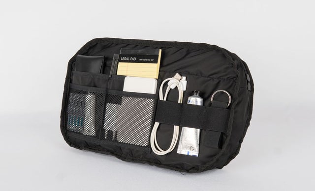 十分なメイン収納と使える内ポケットで持ち物を整理できます。バッグ内が小物でごちゃごちゃにならないように二重ポケットやゴムバンドが構成されています。何が入っているか分かるようにポケットはメッシュになっています。