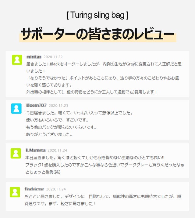 前回プロジェクトでは1200名以上のサポーターの皆さまにご支援いただき、目標金額の12106%を達成することができました。Turing series(チューリングシリーズ)のミニクロスバッグとスリングバッグをご支援して下さったサポーターの皆様、応援して下さった皆様に厚くお礼申し上げます。