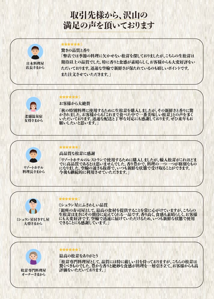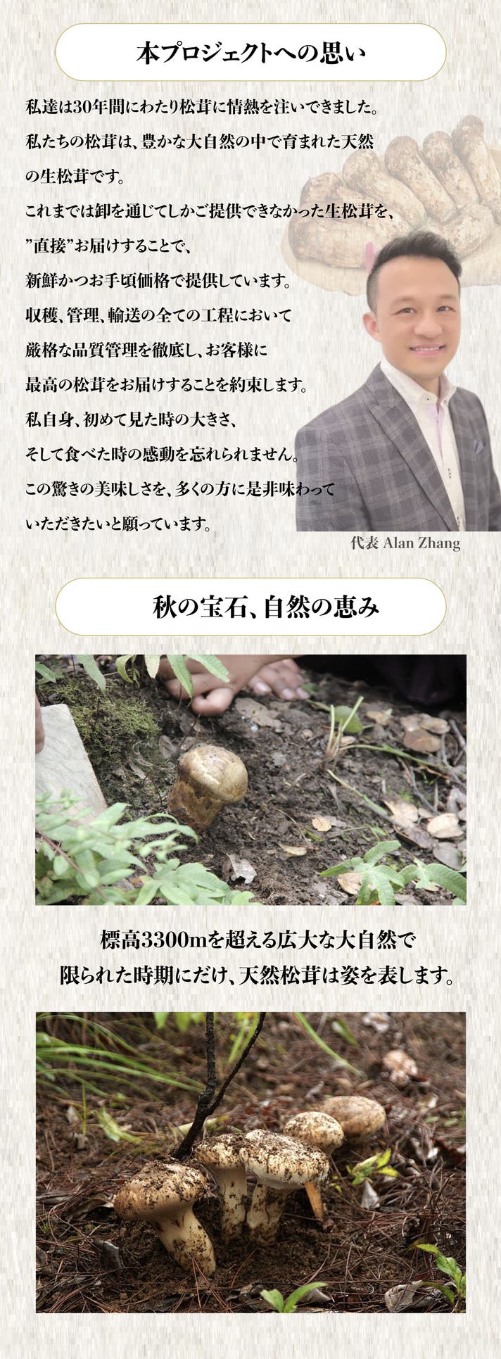 この度は、私たちの商品にご関心をお寄せいただき、誠にありがとうございます。私たちは30年以上、世界中のお客様に生松茸お届けしてきました。その経験を活かし、皆様に最高の松茸をお届けすることを目指しています。