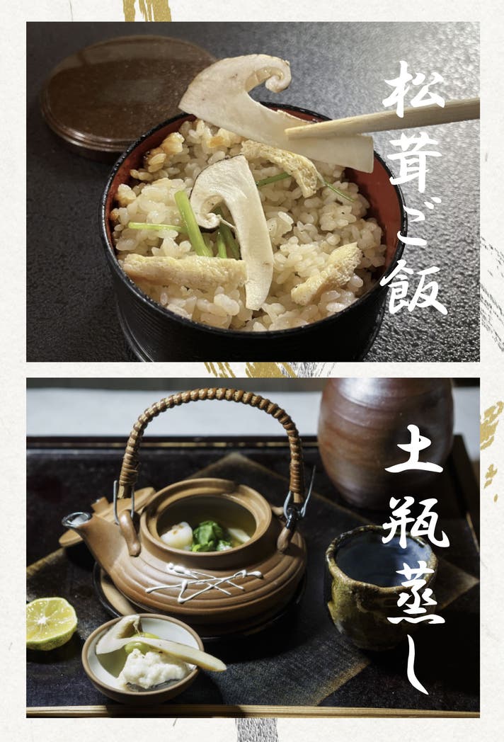 贅沢に丸々1本を焼いても良し、天麩羅から土鍋まで様々な調理法で最大限に生松茸を存分に楽しめる、これぞまさに“贅沢の極み”。