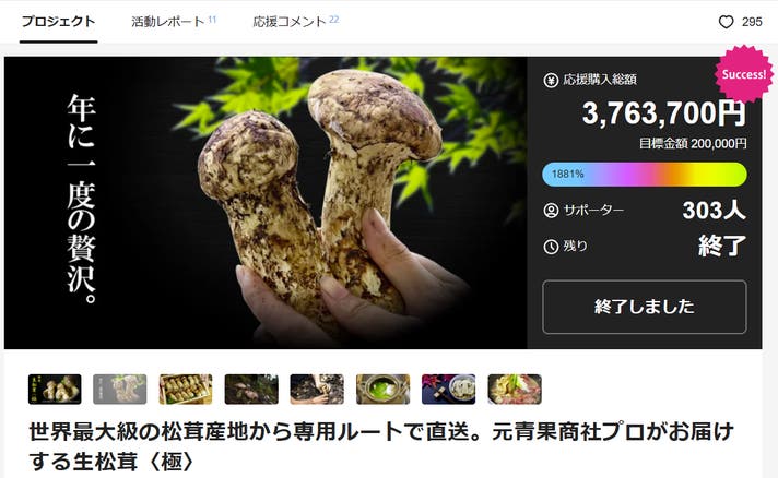 こんなに立派な松茸は40年ぶりです。家族で存分に堪能しました。また、機会があればプロジェクトを応援させて頂きたいです。