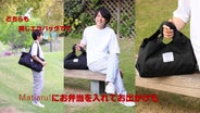 お買い物の時、今日はお弁当にしようと思ったときMatiaru!の中心にお弁当を入れサイドのホックを外し引っ張りながら中心で結びます。さらに内ポケットの上にある細い紐を結びます。これで平行に保てる手提げ状態になります。