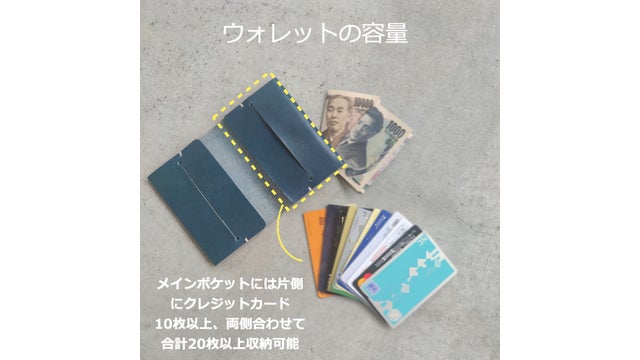 ウォレットはポケット、カードスリットが2カ所ずつ配置されています。よく使うキャッシュカードや、交通系ICカードなどはスリットに入れ、その他のカードや、紙幣などは、ポケットに収納することを想定しています。紙幣は3つ折りにして収納するのがおすすめです。クレジットカードでしたらポケット1つに10枚は十分に収納できます。