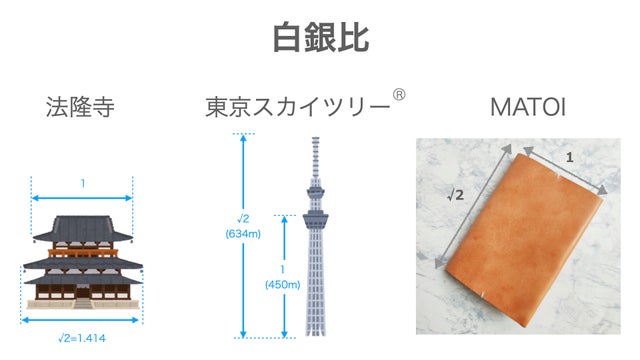 余計なギミックを一切排除し、とにかくシンプルに仕上げるというコンセプトのもと、開発に取り組みました。デザインには白銀比を採用。白銀比とは、1:√2を意味し、その比率で構成されるものは人間にとって『美しい』と認識されます。欧米ではダヴィンチの作品や、パルテノン神殿に採用されている比率の異なる黄金比が有名ですが、日本ではむしろ白銀比が好まれる傾向にあり、法隆寺や、東京スカイツリー®、ドラえもんなどもデザインに白銀比が使われています。