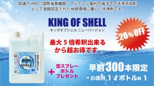 バージョンアップした「キングオブシェル」は、5倍希釈できるから5倍お得な溶液で、洗浄能力も変わりません。1ℓ溶液は5ℓ分の溶液に、2ℓ溶液は10ℓ分の溶液になるから超お得です。