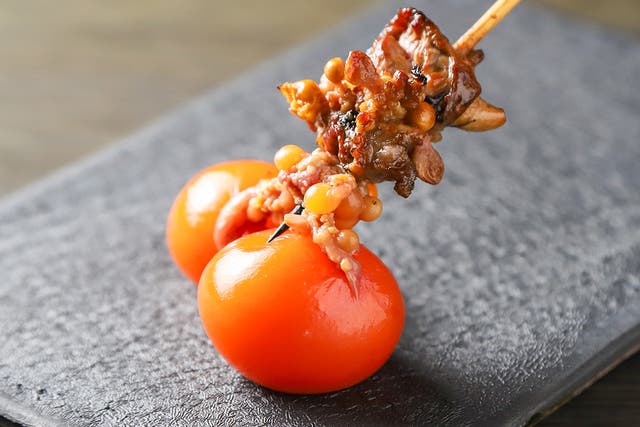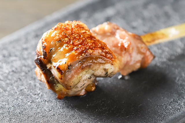 鳥取県産「鹿野地鶏」を使用。鹿野地鶏は「軍鶏」と「ロードアイランドレッド」を交配した鶏に「白色プリマスロック」を交配させた三元交配により誕生した鶏。低脂肪でコクがあり歯ごたえが良いのが特徴です。「まつもと」のもも肉は串の一番上、つまり一口目に「皮」を刺しております。一口目に皮のカリッとした食感をお楽しみいただいたのち、ジュワッと脂ののったもも肉を召し上がっていただけるよう、串打仕方も工夫をしております。」
