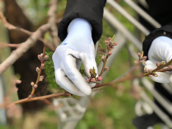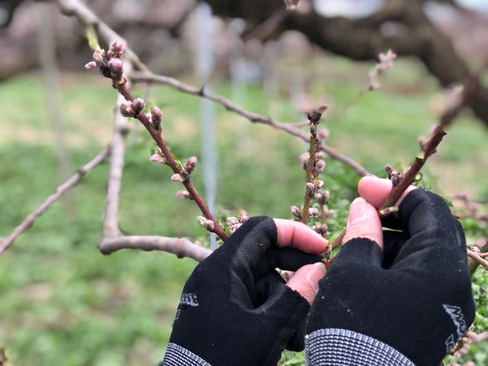 強い枝だけを残し、力強い実だけが育つように摘果をする。選び抜いた果実だけ