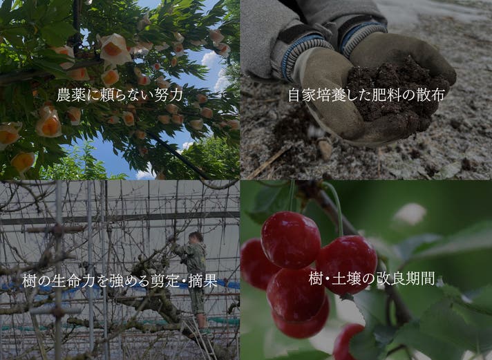 生命力のある強い実を残すように剪定・摘果を徹底し、少数精鋭で大粒に育て、うまみと栄養がたっぷり詰まったさくらんぼに仕上げます。