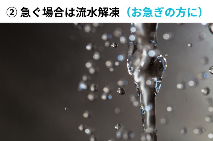 袋に入ったまま、流水で10〜15分ほど解凍することも可能です。