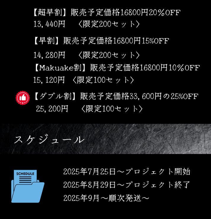 ・ご注文状況、原材料の仕入れ、製造工程上の都合により出荷時期が遅れる場合がございます。 あらかじめご了承ください。 ・包材等の仕入れ状況により、仕様や外装デザインが変わる可能性がございます。 ※応援購入の数が想定を上回った場合、製造工程上の都合などにより出荷時期が遅れる場合がございます。 ※本文中に記載させていただいたスケジュールはあくまでプロジェクト公開時点の予定です。 応援購入の性質上、配送遅延の恐れがございます。 ※原則として配送遅延に伴る応援購入のキャンセルはできませんが、リターン配送予定月から3ヵ月を超えた場合には希望者に限りキャンセルにて対応させていただきます。