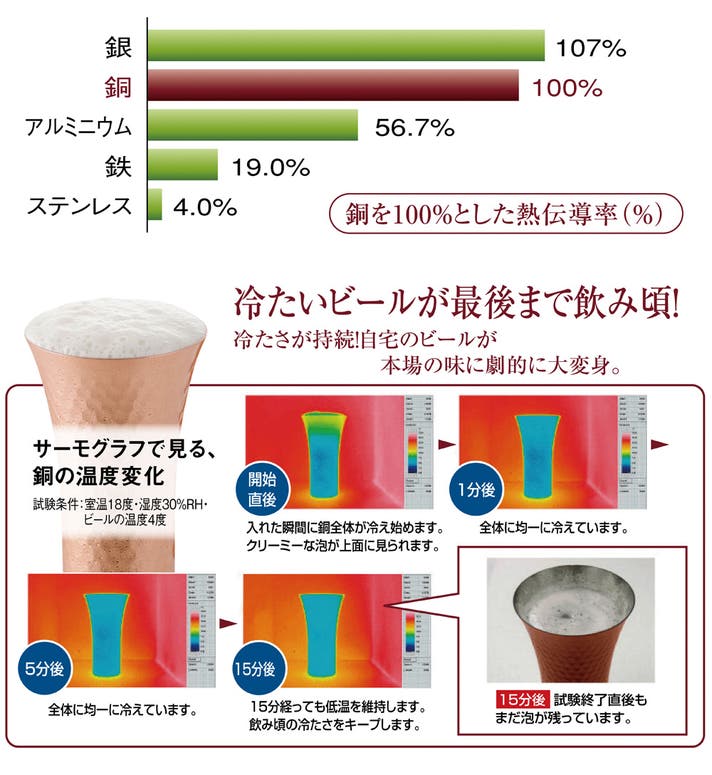 - 銅の優れた熱伝導で、ビールの冷たさもコーヒーの温かさも長く保つ。